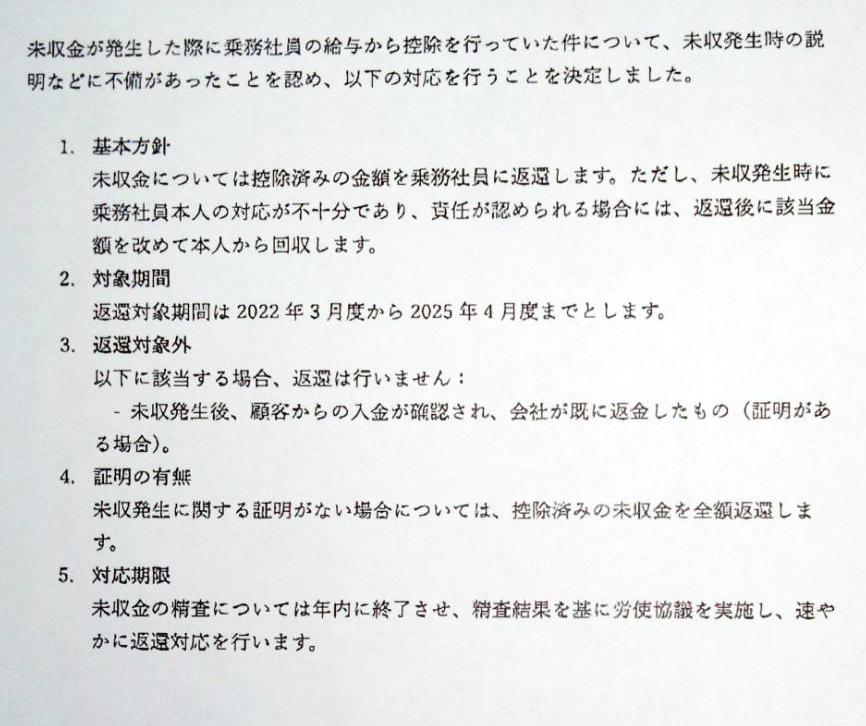 未収金の乗務員立て替え問題への会社回答(2025.10.10)