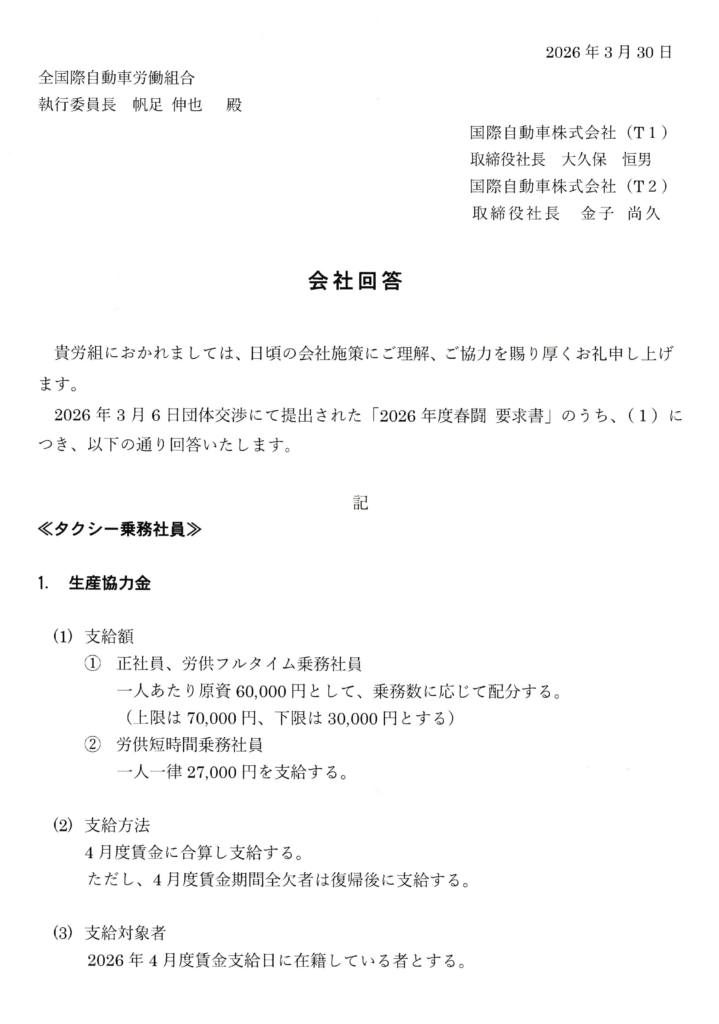 2026春闘、ほぼゼロ回答!! 2026年3月30日(月)、大森の貸会議室にて別紙の通り回答がありました。 生産協力金に於いては、またしても乗務日数に応じて金額が増減される。これは労基法136条に抵触する可能性があります。 当組合としては、どのように金額が算定されるのか資料提出を4月3日(金)までにと要求しました。 その資料を確認の上、相応の対応を考えております。 春闘要求に関する会社回答